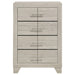 This four-drawer chest offers a stylish combination of rustic charm and modern design, making it a perfect storage solution for contemporary bedrooms. Finished in a rustic cream with rough-sawn, white-washed engineered paper veneer, it has a warm, textured appeal that’s both inviting and chic. The extra-wide polished nickel handles add a sleek, modern touch, creating a subtle contrast. Built with engineered wood, the chest features English dovetail joinery and Center metal glides for durability and smooth functionality, ensuring it meets both aesthetic and practical needs.
