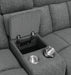 A trio of recliners and pair of consoles create a theater-inspired seating experience for your home. A modified power reclining sofa is the ultimate in indulgence, creating plush comfort and relaxation for movie marathons and Sunday game days. Charcoal fabric upholstery is smooth and soft, complementing seating designed for exceptional comfort and support. Each seat is divided with a storage console, offering a spot for snacks and essentials and offering a pair of cupholders that keep refreshments within reach. On either end of the sofa, pillowtop arms add plush, inviting style for your living area or dedicated media room.