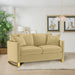 Indulge in opulent comfort with this textured velvet loveseat. Its reversible feather blend seat and back cushions, complemented by curved arms and gold stainless steel legs. Smooth upholstery and lustrous details blend simplicity with timeless splendor, making this piece a perfect focal point for refined interiors. With its inviting profile and graceful presence, it elevates both style and relaxation.