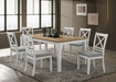 Enjoy delicious dinners and the company of friends and family when gathered at this five-piece cottage dining set. Offering casual charm, the set centers on a two=tone rectangular dining table that comfortably seats six. The tabletop is a warm, natural wood finish that plays well in modern farmhouse and casual contemporary decor, setting a relaxed tone for meals, games, and even homework. The table's base receives a white finish to complement its clean-lined design and gently tapered legs. Four chairs are included with the set, offering a white finish with an open back decorative with an X-cross detail and a foam-padded seat in light gray upholstery that maintains a soothing, neutral color palette.