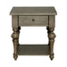 Liberty Furniture Americana Farmhouse End Table in Dusty Taupe 615-OT1020. Functional and fashionable is the America Farmhouse end table. Crafted of poplar and rubberwood solids and white oak veneers with a dusty taupe finish. Features one full extension drawer for remotes or magazines, a bottom shelf for additional storage and heavy turned legs with tulip feet. Perfect beside your favorite chair or sofa.