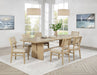 Create a warm and inviting dining space with this beautifully coordinated dining set, combining the natural elegance of a spacious dining table and handcrafted dining chairs. The table, crafted from solid wood, engineered wood, and oak veneer, features a smooth rectangular top with rounded edges and an 18-inch extension leaf. Paired with the hand-woven radio weave cane dining chairs, this set adds a touch of artisanal charm and natural beauty to any room. Each chair is designed with a sturdy wood frame, a foam seat cushion upholstered in soft beige fabric, and a light, airy backrest that balances comfort and style. Together, the table and chairs offer a seamless blend of durability and sophisticated design, making this set perfect for family meals, gatherings, or special occasions. Key Features: • Seven-piece dining set includes a spacious table and hand-woven cane back dining chairs • Table with 18-inch extension leaf crafted from solid wood, engineered wood, and oak veneer • Hand-woven radio weave cane backrests on chairs add artisanal detail • Chairs feature foam seat cushions upholstered in soft beige fabric for comfort • Perfect for creating a cohesive, stylish look in modern or traditional dining spaces