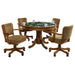 Perfect for an entertainment room or versatile space, this five-piece dining set is all fun and games. Enjoy a morning cup of coffee by day and poker or bumper pool by night with the three-in-one table top. Completely classic, this Craftsman-inspired set features a light and warm hue. Including four arm chairs and pool sticks and balls, the solid oak construction is relaxed with delicate curves and carvings. Full of plush cushions and casters, the comfortable chairs boast hours of entertainment.